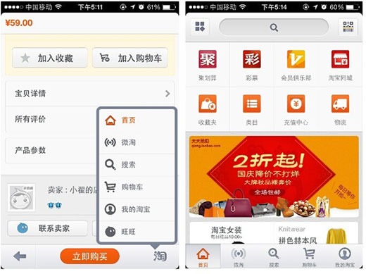 扁平化建設通常為了簡約,則減少了一些功能按鈕的設置,造成用戶瀏覽時出現使用障礙,要想保證網站原有的應用效果,取而代之的是交互設計,例如客服窗口,可用浮動按鈕的形式彈出對話框,既可不用占用頁面的資源,也可保證用戶在線互動窗口在顯眼的位置,方便被找到;再如下面的淘寶網站上的交互按鈕運用,用戶不管點擊了多少層頁面,如果想回到首頁,并不需要層層返回,只需點擊右下角的按鈕,則可輕松返回首頁。