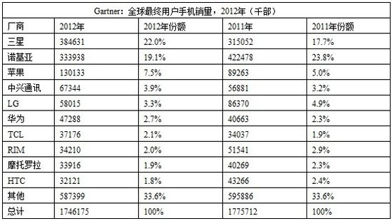 那么,我們可以再假設一下,假如沒有Android和IOS,使用我國自主研發的操作系統,我們的智能手機市場發展及移動互聯網發展又將會是什么樣子?我們可以首先從手機的種類上分析一下。根據2012年的手機銷量報告顯示,目前全球手機銷量前三的分別是三星,諾基亞,蘋果。而三星的操作系統本身就是由谷歌所授權的Android,而蘋果所使用的就是其IOS系統,這其中唯有諾基亞使用的是Symbian系統。但是別忘了,Symbian系統本來也不是我們自主研發的系統。我們再看看這份2011年和2012年出貨榜單上的前十名,
