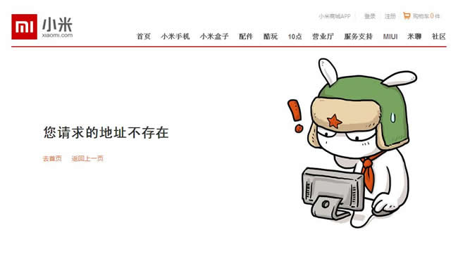 我們先來看一下在手機銷售行業一枝獨秀并憑此獲得中國2012年度經濟人物獎的雷軍的小米。這就是小米手機官網的404頁面,很普通,一個圖片,一句“您請求的地址不存在”,兩個選項“去首頁”或者“返回上一頁”就完事了。與小米手機的別出心裁來比真是有點讓人失望呢!