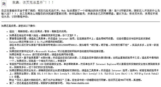 不知道大家有沒有看到過這個。是筆者一次在一個站長網無法打開時所顯示的404頁面。與其他網站的404頁面不同,它既沒有圖片頁面好看,也沒有直截了當的提示,再看其內容,具有很濃重的星爺的嘻哈搞笑風格,如果你真的按照它所說的去做,你就傻了。如果剛開始接觸互聯網的人看到這個頁面,估計它的電腦和身邊的人都得遭殃了。筆者為什么要放這么一個404頁面上來,因為它能夠徹底改變我們眼中程序員的“木訥”“枯燥無味”之類的看法,而且它的語言表達風格很有年輕一代的特色,可以說是一個時代的特征之一。