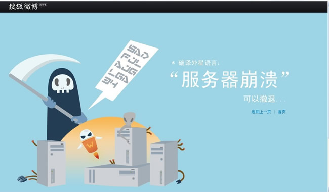 這個是搜狐微博的。可謂是意外的發現,早上點微博的時候出現的。真是充滿了中國神話的色彩,一方面用死神代表服務器出現了問題,另外一方面用一堆看不懂的符號來表示外星語言,旁邊加上注釋“服務器崩潰,可以撤退……”碰上這兩個家伙,真是應當馬上撤退呀!