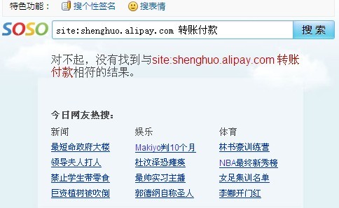 為了驗證其他國內搜索引擎是否有相關現象出現,筆者分別使用了“付款轉賬”“支付寶轉賬”“site:shenghuo.alipay.com付款轉賬”等相關關鍵詞在百度、360綜合搜索、SOSO搜索來進行驗證,結果發現,百度搜索對所有關鍵詞的搜索都會得出數量不多的相關項目,但是并沒有出現類似谷歌搜索中用戶轉賬支付信息,而360綜合搜索與SOSO搜索對于中文文字關鍵詞搜索也得出了一部分的搜索相關項,但在使用“site:shenghuo.alipay.com付款轉賬”搜索時卻沒有任何結果。如下圖: