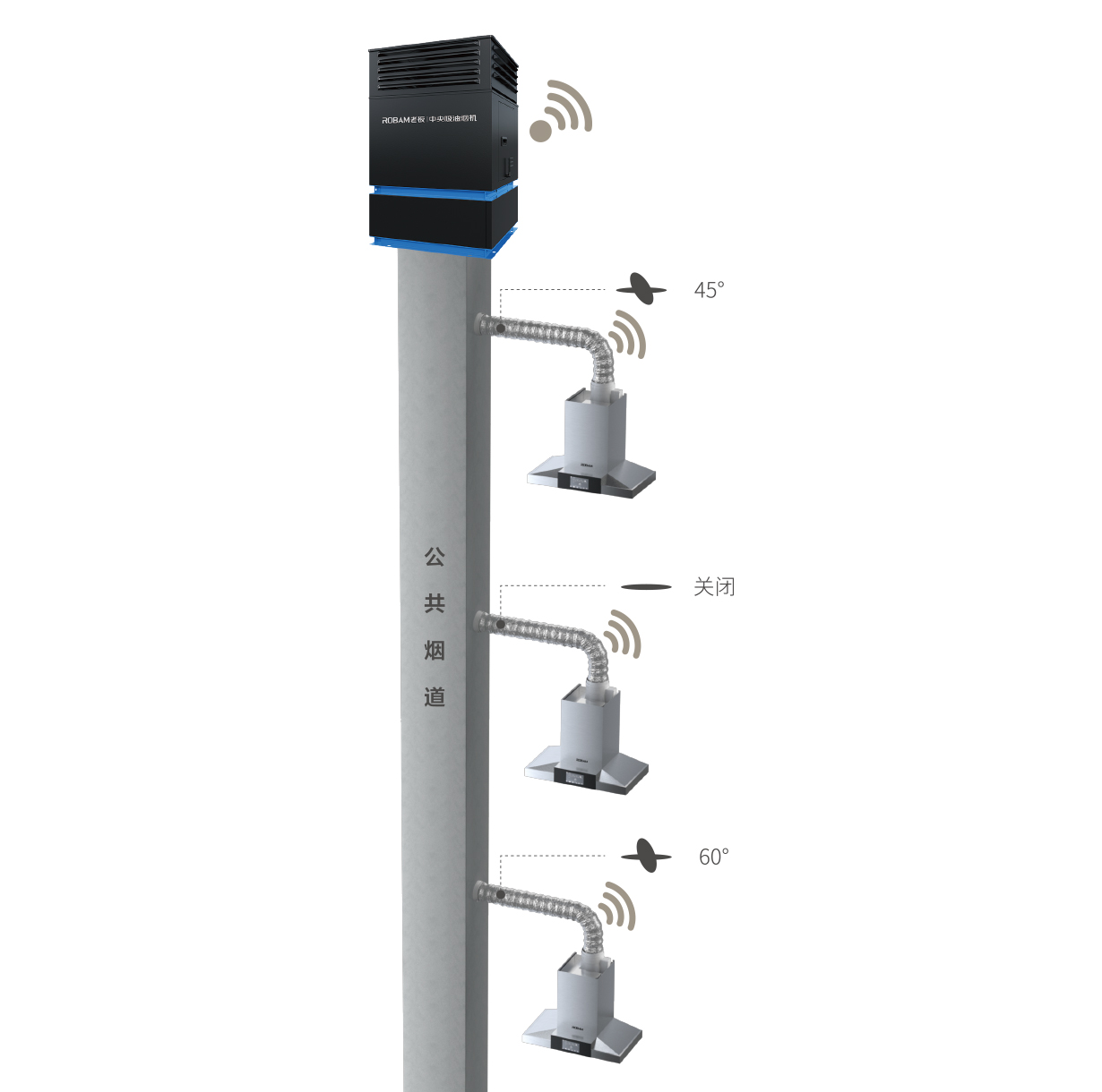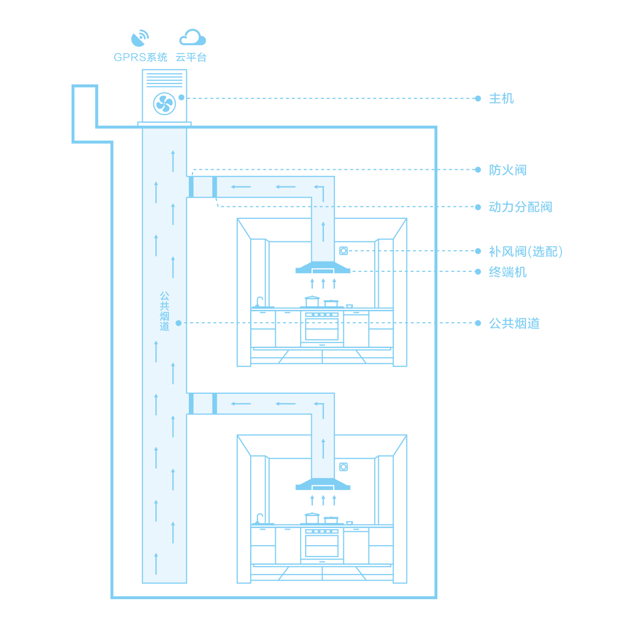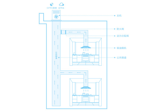 由主機、無動力終端機、動力分配閥、防火閥、補風閥(選配)、云平臺等組成,可從廚房、煙道、社區天臺多維度全面解決油煙問題